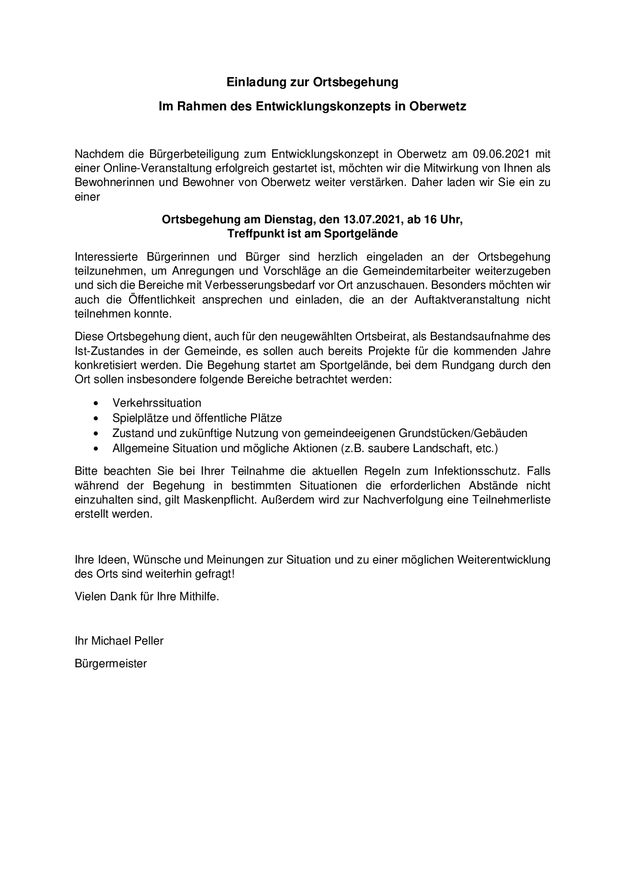 Das Konzept zur Entwicklung des historischen Ortskerns von Oberwetz kann in den kommenden Jahren während der Laufzeit des Sanierungsprogrammes immer angepasst und verändert werden, daher sind uns Ihre Anregungen und Wünsche für Oberwetz immer willkommen.